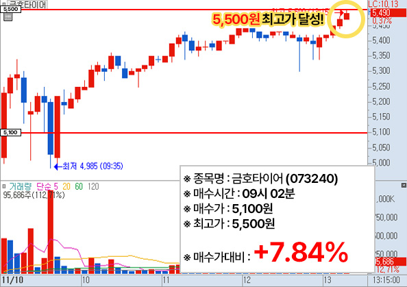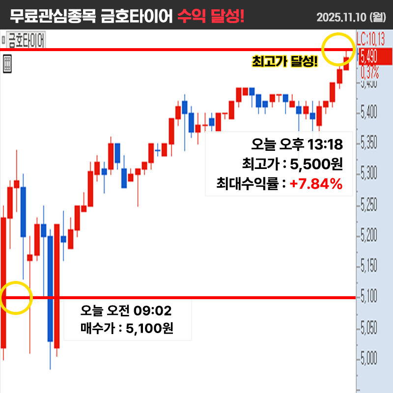 오늘 무료관심주 금호타이어 5분봉 차트 입니다.