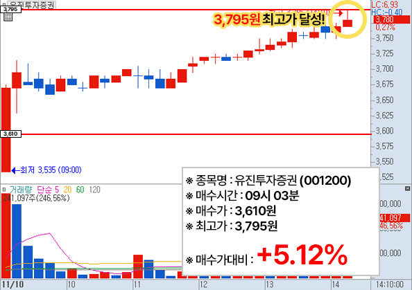 오늘 무료관심주 유진투자증권 10분봉 차트 입니다.