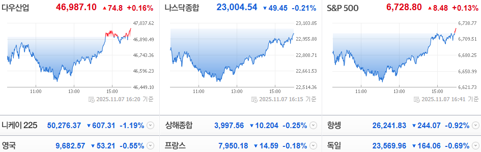 이날 국제유가는 트럼프 러시아 원유 헝가리엔 예외적 허용 검토 소식 등에 소폭 상승, 채권시장은 美 소비심리 악화, 다음주 입찰 경계감 등이 엇갈리며 혼조세를 나타냈고, 달러화는 경기 둔화 우려, 셧다운 해제 기대감이 엇갈린 가운데 약세를 기록했습니다.