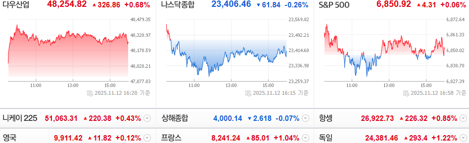 이 날 뉴욕증시는 역대 최장기간 이어졌던 美 연방정부의 셧다운(일시 업무 정지)이 해제될 것이라는 기대감이 이어졌지만, 주요 기술주에 대한 밸류에이션 부담이 커지면서 혼조세로 장을 마감했습니다.