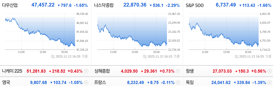 전일 미국의 셧다운이 종료되었지만 셧다운 기간 동안에 경제 지표에 대한 불확실성이 연준의 금리 인하 기대감을 악화시키면서, 3대 지수가 모두 급락한 모습입니다.