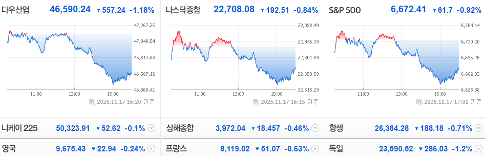 AI 거품론 지속·Fed 금리인하 기대감 약화, 필라델피아 반도체지수 약세 영향 등에 하락