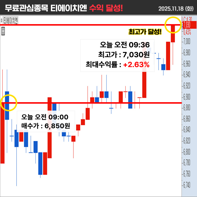 관심 매수가 6,850원 제시해 드렸고 관심 매수가 대비 +2.63% 상승했습니다.