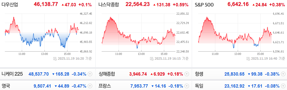 이날 국제유가는 美 우크라전 '종식 시도' 소식 등에 급락, 美 채권시장은 10월 고용 취소·매파 의사록 등에 금리 인하 불확실성이 커진 영향으로 하락했으며, 달러화는 강세를 기록했습니다.
