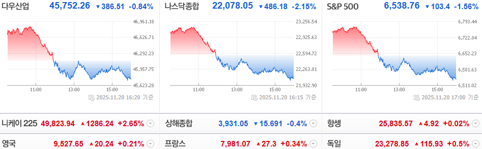 이날 뉴욕증시는 엔비디아의 깜짝 실적에도 인공지능(AI) 거품 우려가 다시 부각되며 3대 지수 모두 하락했습니다.