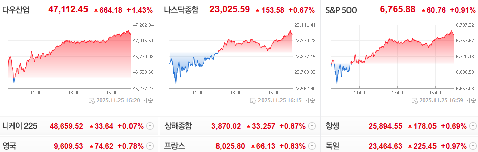 미국 증시가 금리 인하 기대감과 AI주 리밸런싱이 이뤄지며 3대지수 강세로 마감된 이유로 국내 증시도 강세 영향을 받는 중입니다.