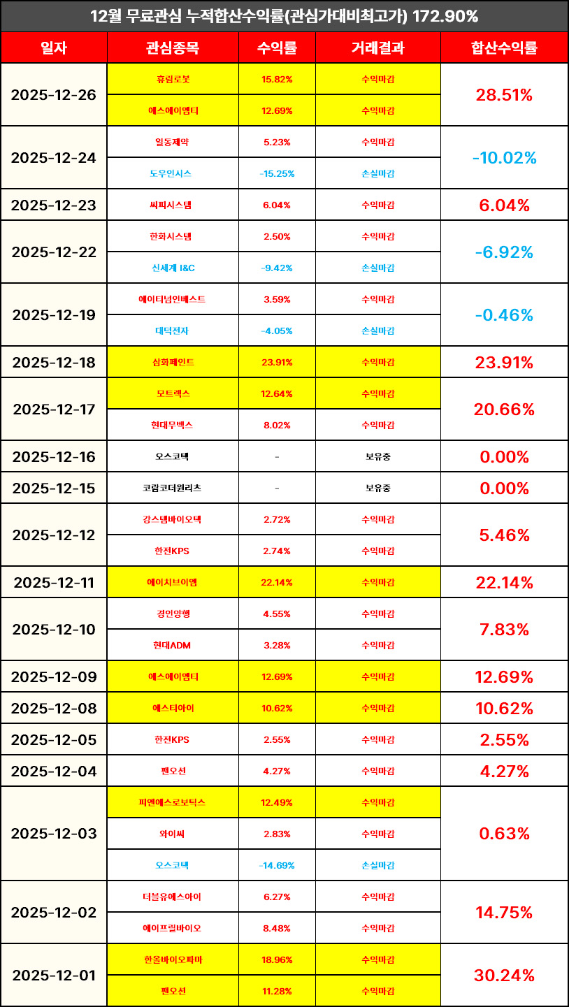 12월 26일 금요일 무료관심종목+15.82%(2전/1승/1종목 보유중)