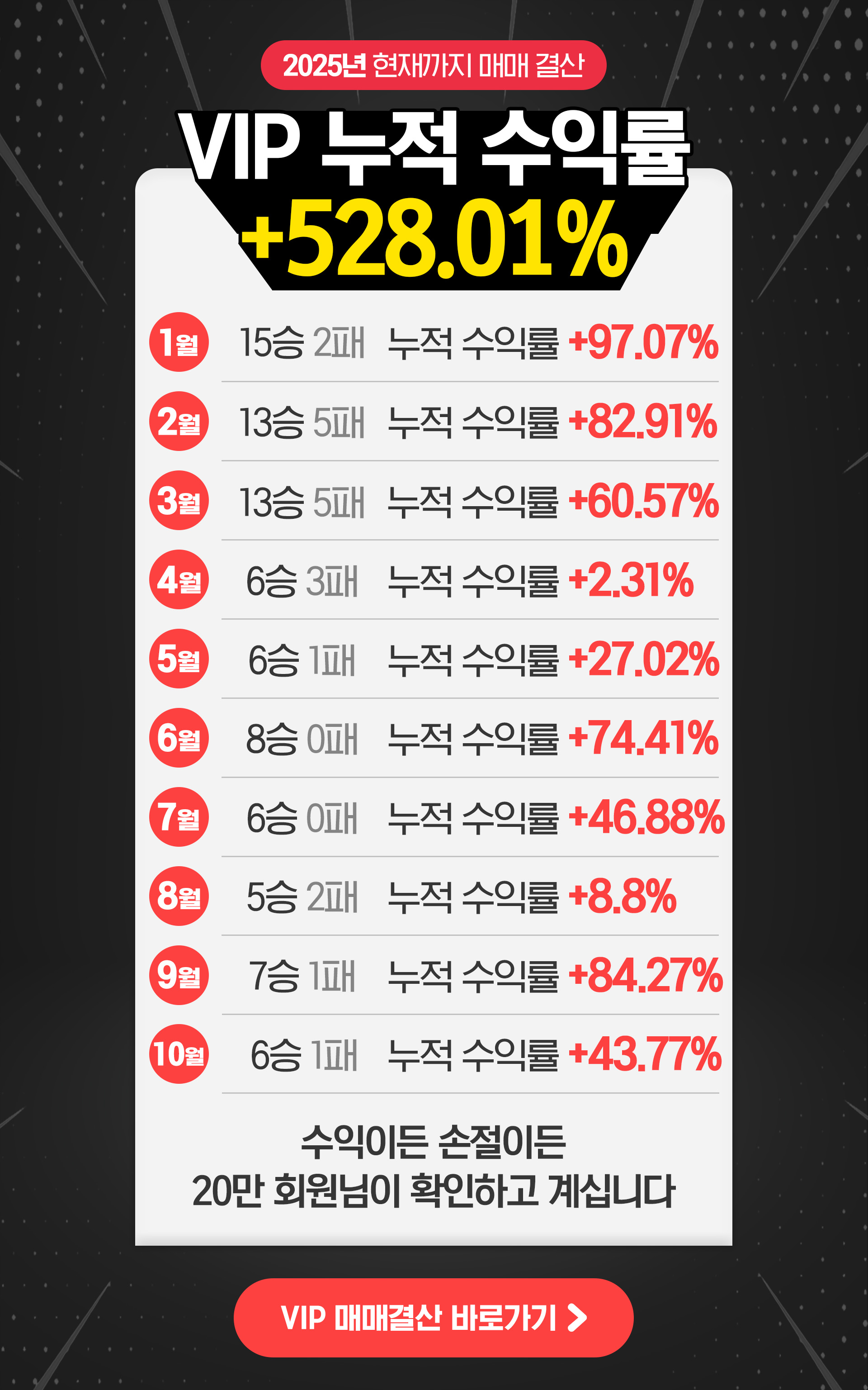 V.I.P 회원제도는 저 김용재가 직접관리하며 무료종목과는 다른 별개의 종목으로 리딩하고 있습니다.