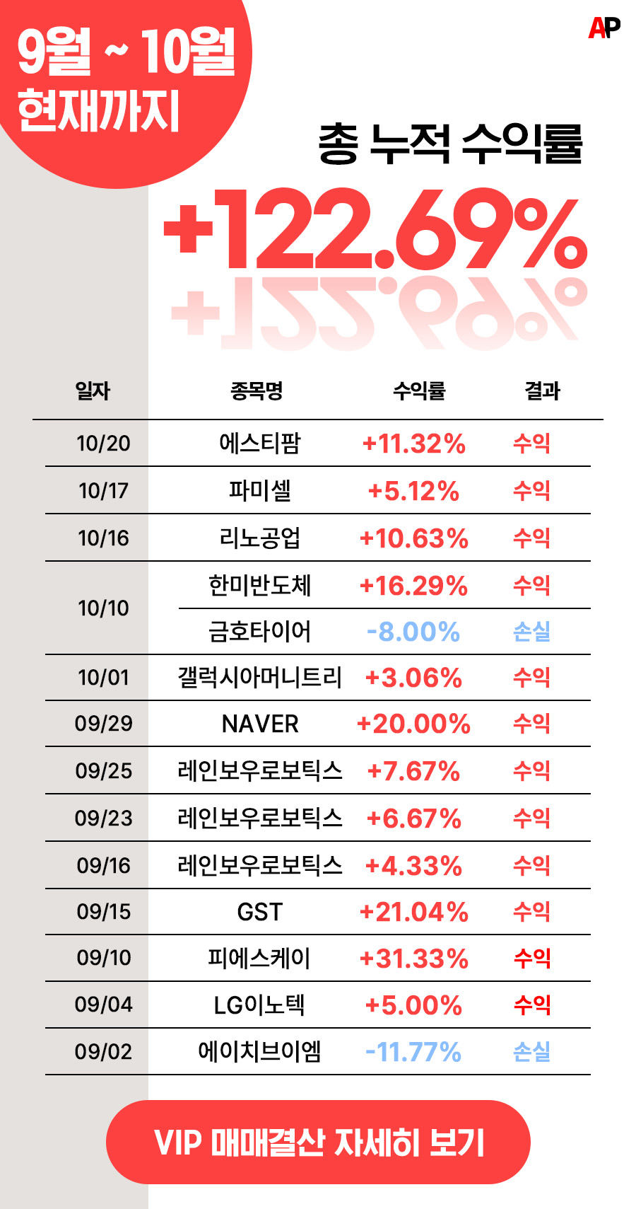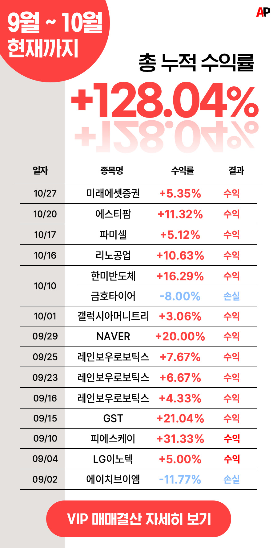 그리하여 현재 저희 AP 투자연구소에서는 일반회원 이외에 따로 제가 운영하는 V.I.P 회원들을 모집하여 종목추천을 해드리고 있습니다.