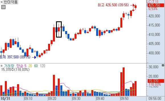 ▶ 한미약품 (128940) - 현재시간 9시24분 가격 : 415000원