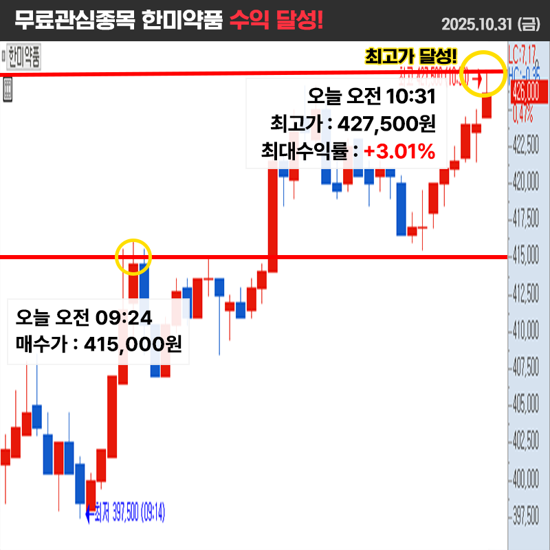 관심 매수가 415,000원 제시해 드렸고 관심 매수가 대비 +2.77% 상승했습니다.