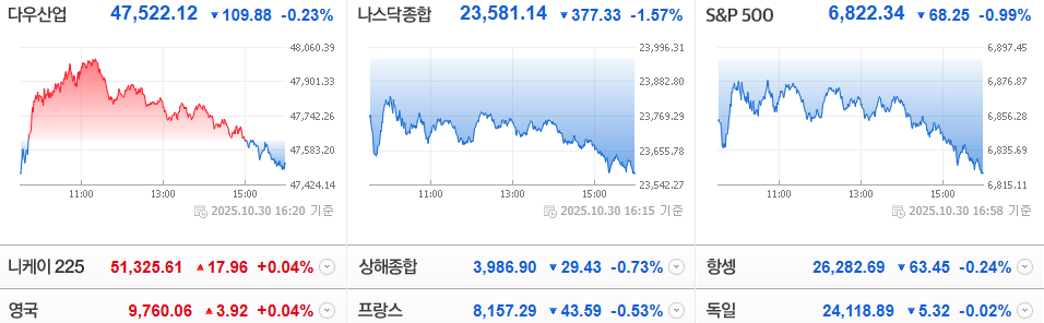 이날 국제유가는 美/中 정상의 불안정한 무역 휴전 속 소폭 상승, 채권시장은 Fed 12월 금리 인하 불확실성 지속, 메타 대규모 회사채 수요 속 약세를 나타냈고, 달러화는 강세를 기록했습니다.