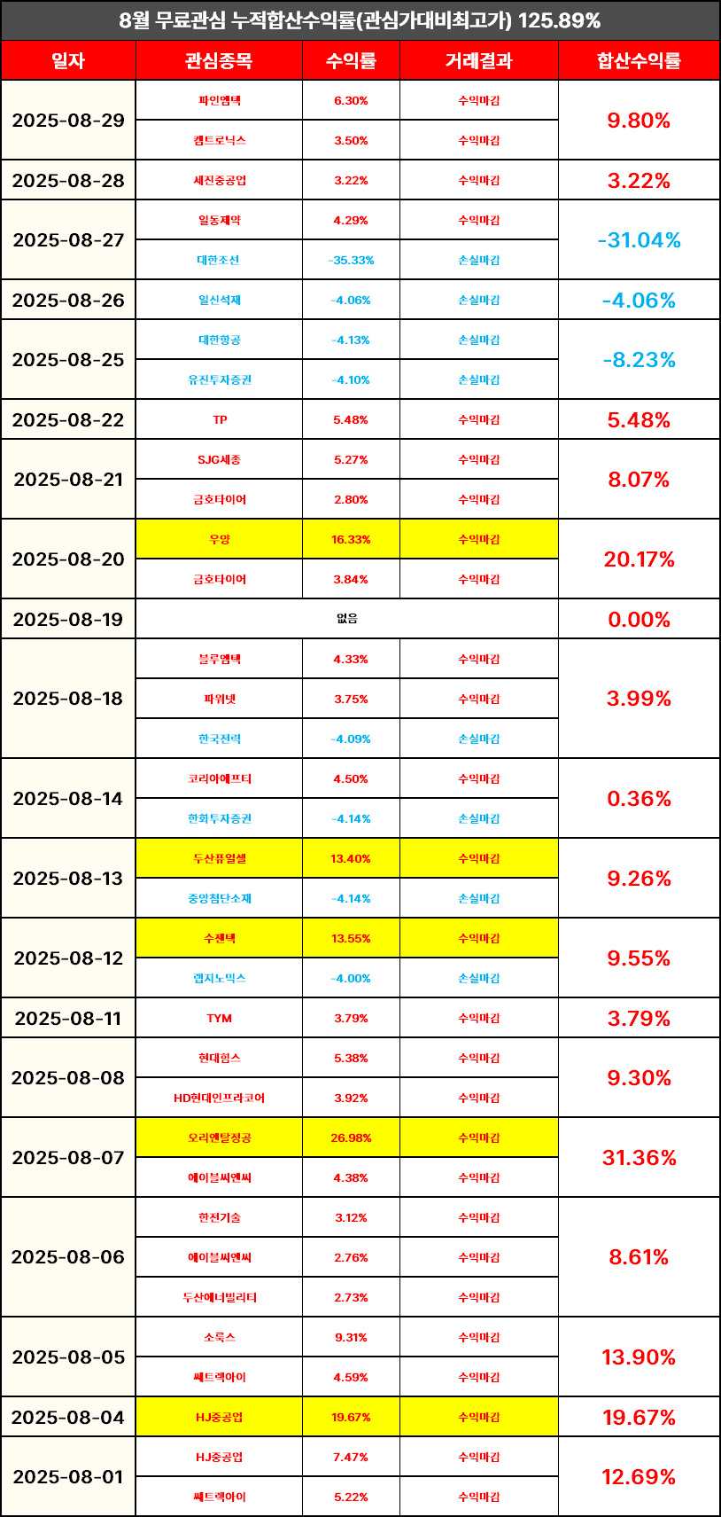 장 마감 후 무료관심종목 결산내역 올려드리도록 하겠습니다.