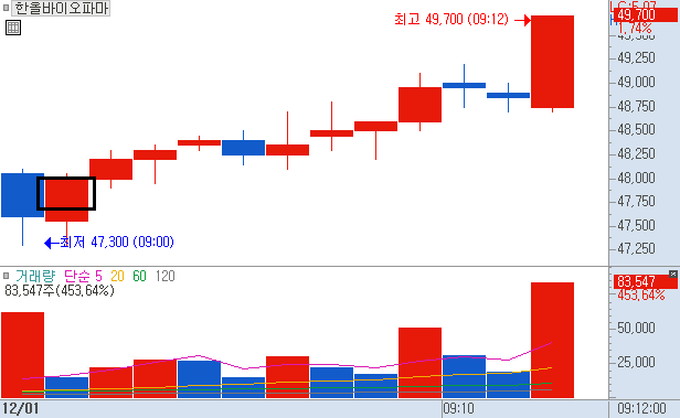 ▶ 한올바이오파마 (009420) - 현재시간 9시02분 가격 : 48000원