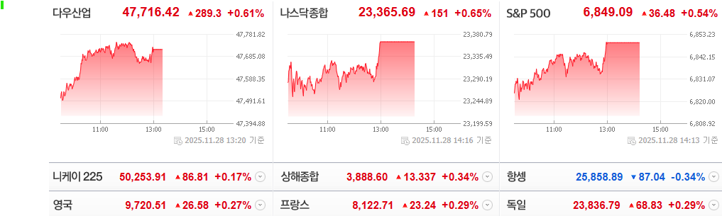 이날 뉴욕증시는 연방준비제도(Fed)의 금리 인하 기대감이 지속되고 있는 가운데, 연중 최대 소비 기간인 '블랙프라이데이'를 맞아 소비 기대감이 커지면서 3대 지수 모두 상승했습니다.