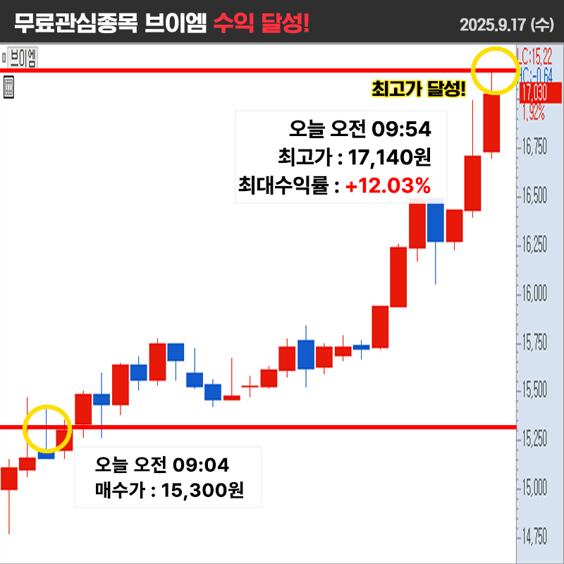 오늘 무료관심주 브이엠 1분봉 차트 입니다.