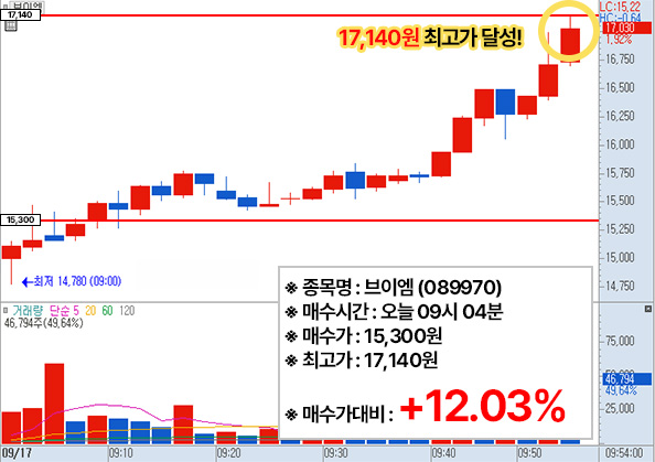 시초 단기세력진입 포착 후 매수한 종목으로 매수가대비 +12.03% 상승하였습니다.