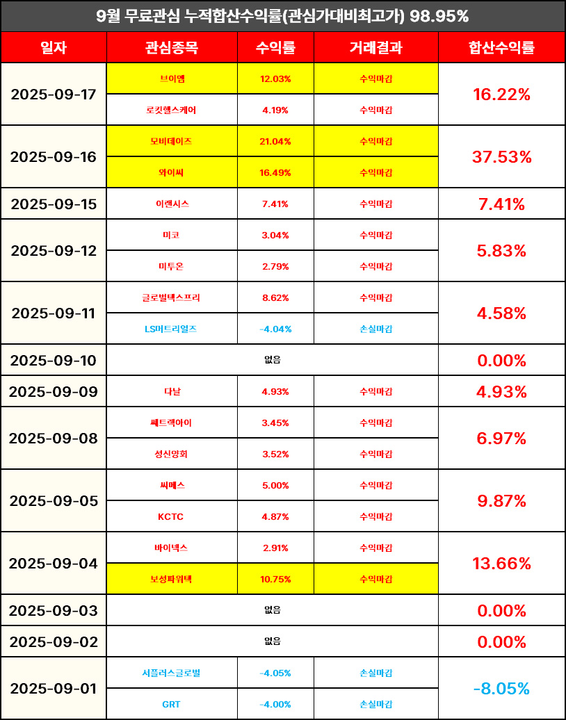 장 마감 후 무료관심종목 결산내역 올려드리도록 하겠습니다.