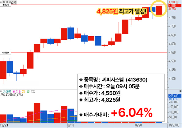 ▶ 씨피시스템 (413630) - 현재시간 9시05분 가격 : 4550원