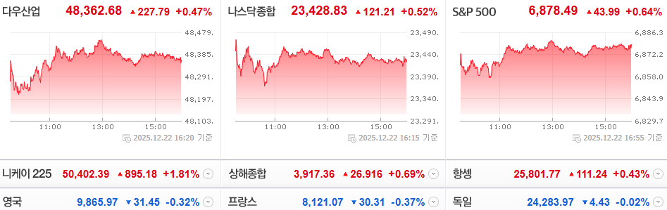 이날 뉴욕증시는 연말 연휴를 앞두고 시장을 움직일 만한 뚜렷한 재료는 없었지만, 주요 기술주들을 중심으로 매수세가 유입되며 3대 지수 모두 상승했습니다.