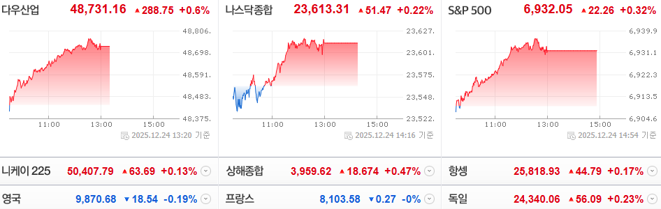 AI 낙관론, 금리 인하 기대, 견조한 경제가 투자심리를 지지하면서 뉴욕 3대 지수 모두 3년 연속 연간 상승을 기록할 것으로 전망되고 있습니다.