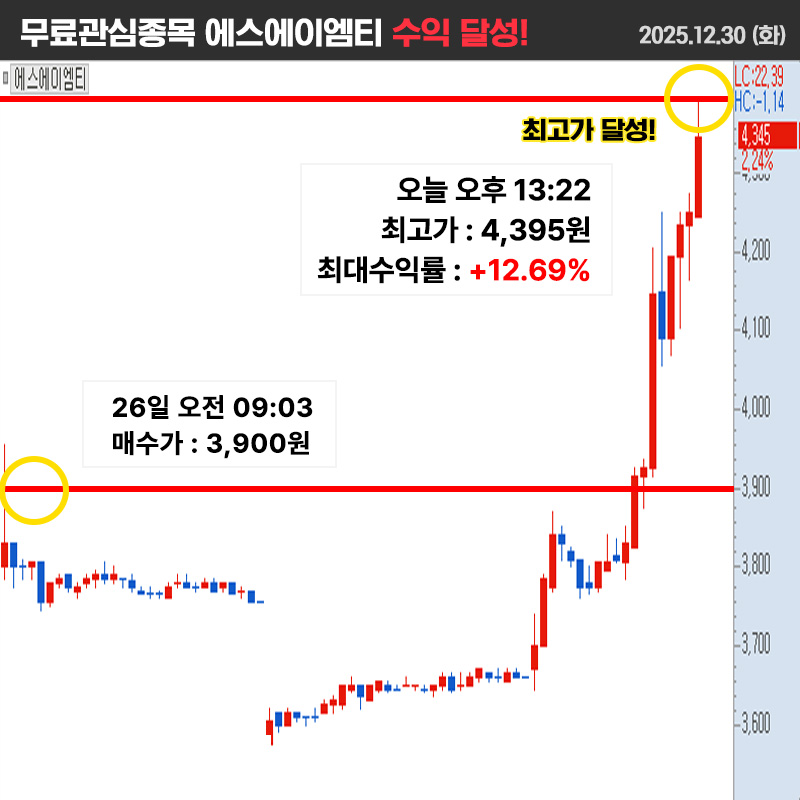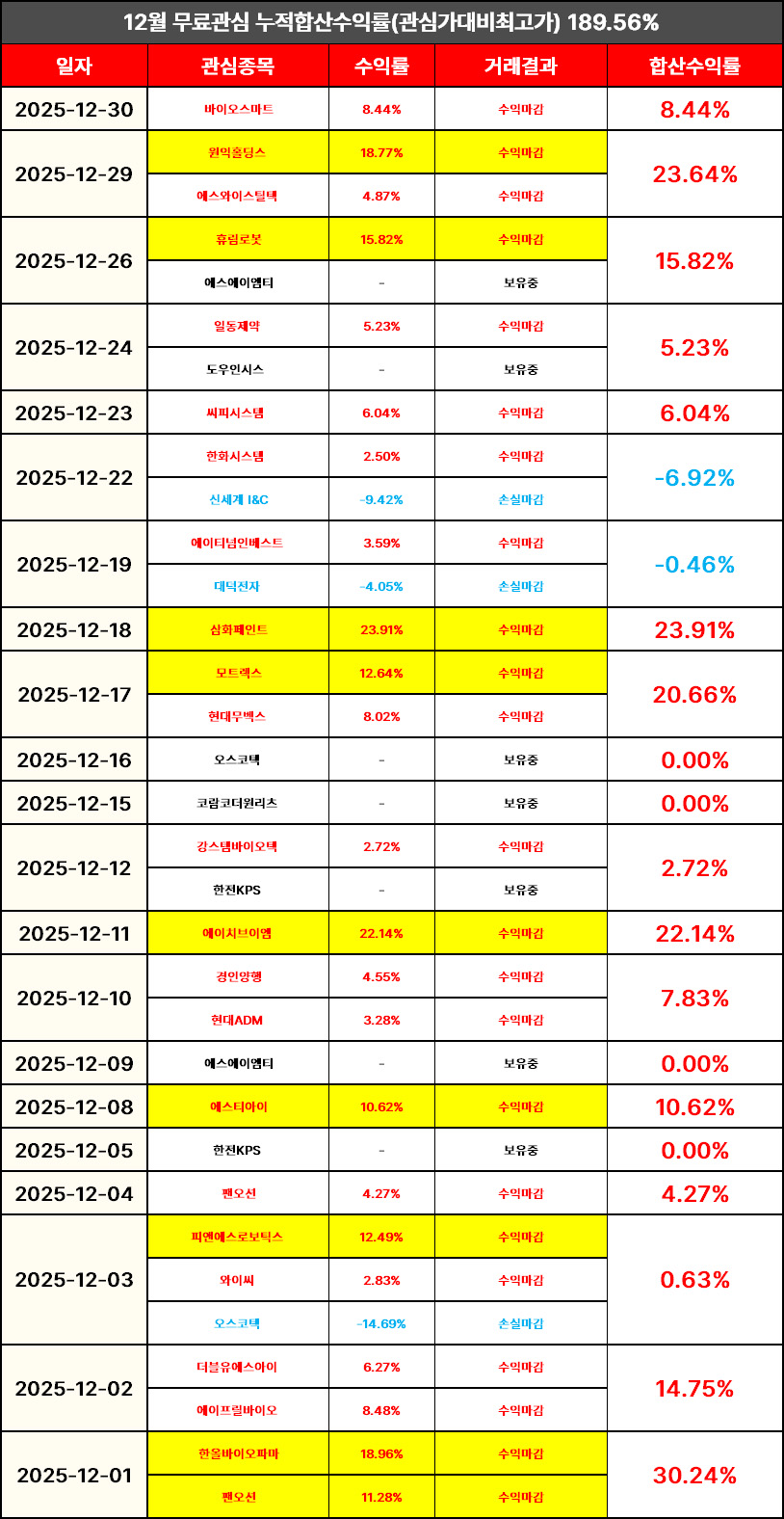 12월 30일 화요일 무료관심종목+8.44%(1전/1승)