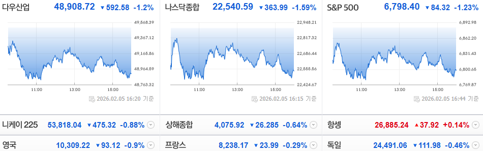 이날 뉴욕증시는 AI 관련 자본지출 부담 및 SW 산업 타격 우려가 이어지면서 투자심리를 위축시키는 모습입니다.