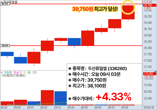 ▶ 두산퓨얼셀 (336260) - 현재시간 9시3분 가격 : 38100원
