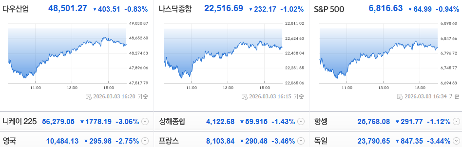 김용재소장님님의 댓글 김용재소장님 26-03-04 07:49 [美 증시 마감 시황]뉴욕증시는 중동발 지정학적 위기로 인해 극심한 변동성을 보인 끝에 일제히 하락 마감했습니다.장중 큰 폭락장이 연출되었으나, 장 후반 낙폭을 상당 부분 만회한 것이 특징적입니다.미국·이스라엘과 이란 간의 군사적 충돌이 격화되는 가운데, 이란의 호르무즈 해협 전면 봉쇄 소식이 전해지며 시장에 큰 충격을 주었습니다.원유 수송의 핵심 통로가 막힐 수 있다는 우려에 원유 가격이 폭등했고, 이는 곧바로 인플레이션 재점화 및 스태그플레이션 공포로 이어졌습니다.오후 들어 도널드 트럼프 대통령이 "미 해군이 호르무즈 해협을 통과하는 유조선을 직접 호송하고 보험을 제공할 것"이라고 밝히면서 극도의 불안감이 다소 진정되었는데요.위험 자산 회피 심리가 강해지면서 기술주 중심의 매도세가 쏟아졌고 안전자산인 통신 관련 섹터가 강세, 현금 보유량이 최대로 오르면서 자산 투심 자체가 급격히 낮아진 것이 확인되고 있습니다. <p><b style="box-sizing: border-box; margin: 0px; padding: 0px; color: rgb(53, 53, 53); font-family: NotoSansCJKkr, NanumGothic, "Malgun Gothic", Dotum, sans-serif; font-size: medium; letter-spacing: -0.56px; background-color: rgb(255, 255, 255);"><span style="box-sizing: border-box; margin: 0px; padding: 0px; font-size: inherit; word-break: keep-all; text-size-adjust: none; letter-spacing: -0.56px;"><span style="box-sizing: border-box; margin: 0px; padding: 0px; font-size: 11pt; word-break: keep-all; text-size-adjust: none;">[美 증시 마감 시황]</span></span></b></p><p><b style="box-sizing: border-box; margin: 0px; padding: 0px; color: rgb(53, 53, 53); font-family: NotoSansCJKkr, NanumGothic, "Malgun Gothic", Dotum, sans-serif; font-size: medium; letter-spacing: -0.56px; background-color: rgb(255, 255, 255);"><span style="box-sizing: border-box; margin: 0px; padding: 0px; font-size: inherit; word-break: keep-all; text-size-adjust: none; letter-spacing: -0.56px;"><span style="box-sizing: border-box; margin: 0px; padding: 0px; font-size: 11pt; word-break: keep-all; text-size-adjust: none;"><br></span></span></b></p><p><b style="box-sizing: border-box; margin: 0px; padding: 0px; color: rgb(53, 53, 53); font-family: NotoSansCJKkr, NanumGothic, "Malgun Gothic", Dotum, sans-serif; font-size: medium; letter-spacing: -0.56px; background-color: rgb(255, 255, 255);"><span style="box-sizing: border-box; margin: 0px; padding: 0px; font-size: inherit; word-break: keep-all; text-size-adjust: none; letter-spacing: -0.56px;"><span style="box-sizing: border-box; margin: 0px; padding: 0px; font-size: 11pt; word-break: keep-all; text-size-adjust: none;"><br></span></span></b></p><p><span style="box-sizing: border-box; margin: 0px; padding: 0px; background-color: rgb(255, 255, 255);"><span style="box-sizing: border-box; margin: 0px; padding: 0px; word-break: keep-all; text-size-adjust: none;"><span style="box-sizing: border-box; margin: 0px; padding: 0px; word-break: keep-all; text-size-adjust: none; font-family: NotoSansCJKkr, NanumGothic, "Malgun Gothic", Dotum, sans-serif; color: rgb(53, 53, 53);"><span style="font-size: 11pt; letter-spacing: -0.56px;"></span><span style="font-size: 14.6667px; letter-spacing: -0.56px;">뉴욕증시는 <b>중동발 지정학적 위기로 인해 극심한 변동성</b>을 보인 끝에 일제히 하락 마감했습니다.<br></span></span></span></span></p><p><span style="font-family: NotoSansCJKkr, NanumGothic, "Malgun Gothic", Dotum, sans-serif; color: rgb(53, 53, 53);"><span style="font-size: 14.6667px; letter-spacing: -0.56px;"><br></span></span></p><p><span style="font-family: NotoSansCJKkr, NanumGothic, "Malgun Gothic", Dotum, sans-serif; color: rgb(53, 53, 53);"><span style="font-size: 14.6667px; letter-spacing: -0.56px;">장중 큰 폭락장이 연출되었으나, <b>장 후반 낙폭을 상당 부분 만회</b>한 것이 특징적입니다.</span></span></p><p><span style="font-family: NotoSansCJKkr, NanumGothic, "Malgun Gothic", Dotum, sans-serif; color: rgb(53, 53, 53);"><span style="font-size: 14.6667px; letter-spacing: -0.56px;"><br></span></span></p><p><span style="font-family: NotoSansCJKkr, NanumGothic, "Malgun Gothic", Dotum, sans-serif; color: rgb(53, 53, 53);"><span style="font-size: 14.6667px; letter-spacing: -0.56px;"><b>미국·이스라엘과 이란 간의 군사적 충돌이 격화되는 가운데, 이란의 호르무즈 해협 전면 봉쇄 소식이 전해지며 시장에 큰 충격</b>을 주었습니다.</span></span></p><p><span style="font-family: NotoSansCJKkr, NanumGothic, "Malgun Gothic", Dotum, sans-serif; color: rgb(53, 53, 53);"><span style="font-size: 14.6667px; letter-spacing: -0.56px;"><br></span></span></p><p><span style="font-family: NotoSansCJKkr, NanumGothic, "Malgun Gothic", Dotum, sans-serif; color: rgb(53, 53, 53);"><span style="font-size: 14.6667px; letter-spacing: -0.56px;"><b>원유 수송의 핵심 통로가 막힐 수 있다는 우려에 원유 가격이 폭등</b>했고, 이는 곧바로 인플레이션 재점화 및 스태그플레이션 공포로 이어졌습니다.</span></span></p><p><span style="font-family: NotoSansCJKkr, NanumGothic, "Malgun Gothic", Dotum, sans-serif; color: rgb(53, 53, 53);"><span style="font-size: 14.6667px; letter-spacing: -0.56px;"><br></span></span></p><p><span style="font-family: NotoSansCJKkr, NanumGothic, "Malgun Gothic", Dotum, sans-serif; color: rgb(53, 53, 53);"><span style="font-size: 14.6667px; letter-spacing: -0.56px;">오후 들어 도널드 트럼프 대통령이 "미 해군이 호르무즈 해협을 통과하는 유조선을 직접 호송하고 보험을 제공할 것"이라고 밝히면서 극도의 불안감이 다소 진정되었는데요.</span></span></p><p><span style="font-family