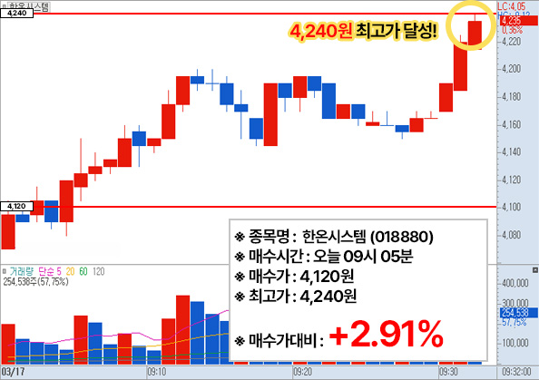 관심 매수가 4,120원 제시해 드렸고 관심 매수가 대비 +2.91% 상승했습니다.