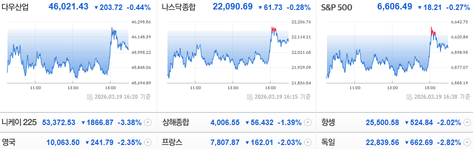 이날 美 증시는 전쟁, FOMC를 소화하며 하락 출발 했으나 장 중 진정되는 유가에 반응하며 전약후강 장세를 보였습니다.