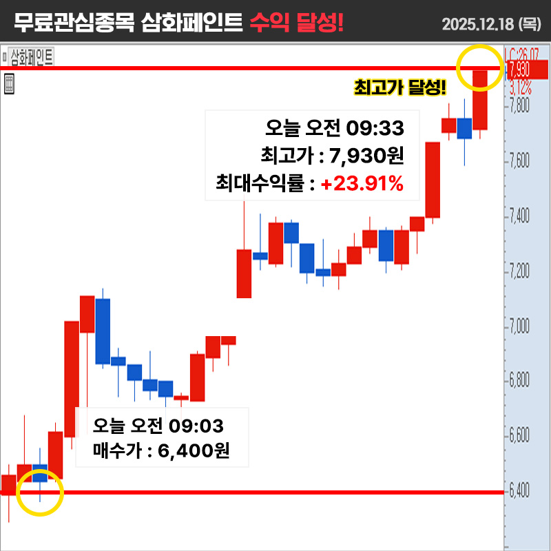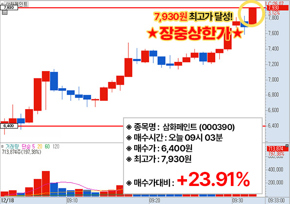 오늘 무료관심주 삼화페인트 1분봉 차트 입니다.