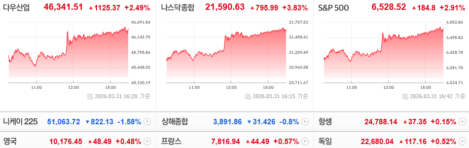 김용재소장님님의 댓글 김용재소장님 26-04-01 08:20 [美 증시 마감시황]이날 美 증시는 이란과의 전쟁이 조만간 종료될 수 있다는 기대감에 상승했습니다. 트럼프, 美 국방부, 이란의 입장을 구분지어 확인할 필요가 있겠는데요.트럼프 _ 호르무즈 해협 개방 없이도 전쟁 종료 의사 있음, 에너지 필요한 국가들 직접 해결하거나 미국에서 사가면 돼美 국방부 _ 향후 며칠이 결정적일 것, 이란이 군사적으로 할 수 있는 건 거의 없고 합의 안하면 더 강도 높은 타격 예정이란 대통령 _ 이란은 전쟁을 원하지 않는다, 추가 공격이 없다는 보장이 있을 경우 끝낼 준비가 돼 있다물론 이란의 경우 대통령보다 혁명수비대의 의사 여부가 더 중요하긴 합니다. 단, 아직 그들의 공식적 입장은 확인되지 않았고요.정리하면 위 내용을 가지고 美 증시가 반등한건데, 트럼프와 국방부의 발언 보다는 이란 대통령의 발언에 투심이 살아났다고 해석됩니다.위 내용에 코스피 야간선물은 6%대 급등을 보였습니다. 국내 증시는 상승 출발이 예상되나, 그 동력이 약간은 모호한 만큼 장중 원/달러 환율 및 상승분 반납 여부에 집중하겠습니다.오늘도 화이팅 하십시오! <p>[美 증시 마감시황]</p><p><br></p><p>이날 美 증시는 이란과의 전쟁이 조만간 종료될 수 있다는 기대감에 상승했습니다. 트럼프, 美 국방부, 이란의 입장을 구분지어 확인할 필요가 있겠는데요.</p><p><br></p><p><b>트럼프 _ 호르무즈 해협 개방 없이도 전쟁 종료 의사 있음, 에너지 필요한 국가들 직접 해결하거나 미국에서 사가면 돼</b></p><p><b><br></b></p><p><b>美 국방부 _ 향후 며칠이 결정적일 것, 이란이 군사적으로 할 수 있는 건 거의 없고 합의 안하면 더 강도 높은 타격 예정</b></p><p><b><br></b></p><p><b>이란 대통령 _ 이란은 전쟁을 원하지 않는다, 추가 공격이 없다는 보장이 있을 경우 끝낼 준비가 돼 있다</b></p><p><br></p><p>물론 이란의 경우 대통령보다 혁명수비대의 의사 여부가 더 중요하긴 합니다. 단, 아직 그들의 공식적 입장은 확인되지 않았고요.</p><p><br></p><p>정리하면 위 내용을 가지고 美 증시가 반등한건데, 트럼프와 국방부의 발언 보다는 이란 대통령의 발언에 투심이 살아났다고 해석됩니다.</p><p><br></p><p>위 내용에 코스피 야간선물은 6%대 급등을 보였습니다. 국내 증시는 상승 출발이 예상되나, 그 동력이 약간은 모호한 만큼 장중 원/달러 환율 및 상승분 반납 여부에 집중하겠습니다.</p><p><br></p><p>오늘도 화이팅 하십시오!</p>