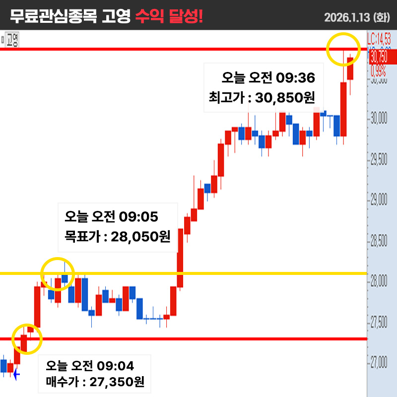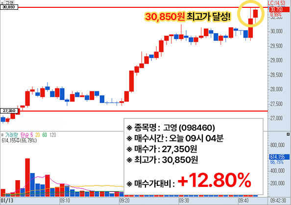 오늘 무료관심주 고영 1분봉 차트 입니다.