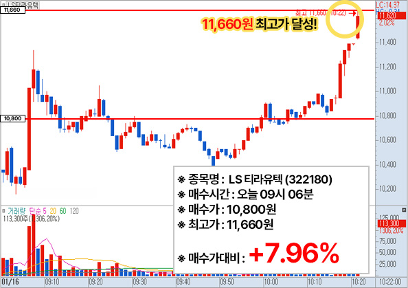 ▶ LS 티라유텍  (322180) - 현재시간 9시6분 가격 : 10800원