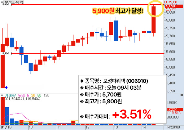 관심 매수가 5,700원 제시해 드렸고 관심 매수가 대비 +3.51% 상승했습니다.