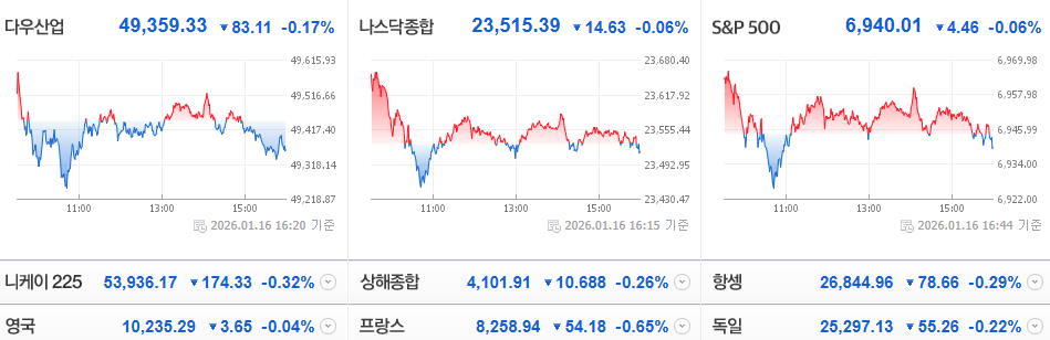 트럼프 행정부의 중동 정책 및 그린란드 관련 발언과 연준 의장 교체 가능성 등 정치적 불확실성이 주말을 앞둔 투자자들의 관망세를 유도했습니다.