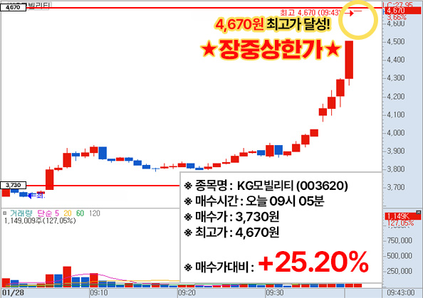▶ kg 모빌리티 (003620) - 현재시간 9시5분 가격 : 3730원