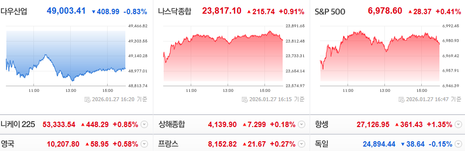 뉴욕증시는 美 빅테크 실적 기대감 속 램리서치(+7.00%), 마이크론 테크놀로지(+5.44%), 어플라이드 머티리얼즈(+4.15%), 인텔(+3.39%) 등 반도체 관련주가 상승, 필라델피아 반도체지수(+2.40%)도 급등. 테슬라, 마이크로소프트, 메타 등 '매그니피센트7'(M7) 주요 종목들은 28일(현지시간) 장 마감 후 분기 실적을 발표하며, 이어 애플도 29일(현지시간) 실적을 발표할 예정. UBS 글로벌 웰스매니지먼트의 울리케 호프만-부르차르디는 블룸버그에 "우리는 기술기업 실적이 강할 것으로 예상한다"며 "또한 우호적인 재정·통화정책 속에 경기순환 업종도 혜택을 받을 준비가 돼 있어 기업이익 성장이 전 업종으로 확대될 것"이라고 밝힘