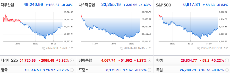 김용재소장님님의 댓글 김용재소장님 26-02-04 07:49 [美 증시 마감 시황]다우 지수는 장중 사상 최고치를 경신했으나 후반 상승폭을 반납했고, 나스닥과 S&P 500은 빅테크 실적 우려에 하락하며 엇갈린 행보를 보였습니다.팔란티어(PLTR)가 어닝 서프라이즈로 급등했으나, AMD 등의 실적 컨센 하회로 클라우드 관련 섹터가 약세를 보였습니다.트럼프 대통령의 인도 관세 인하 및 대규모 구매 합의 발표로 에너지, 농업, 기술 섹터에 긍정적인 모멘텀으로 작용됐습니다.노보 노디스크가 2026년 실적 가이던스를 하향 조정하며 15% 가까이 폭락해 헬스케어 섹터 전반에 하방 압력을 가했습니다.정부의 부분 셧다운 여파로 이번 주 예정된 고용 보고서 등 주요 경제 데이터 발표가 연기될 가능성이 커지며 시장 불확실성이 지속되었으나, 장 마감후 셧다운이 일단락 되었다고 전했습니다. <p><b style="box-sizing: border-box; margin: 0px; padding: 0px; color: rgb(53, 53, 53); font-family: NotoSansCJKkr, NanumGothic, "Malgun Gothic", Dotum, sans-serif; font-size: medium; letter-spacing: -0.56px; background-color: rgb(255, 255, 255);"><span style="box-sizing: border-box; margin: 0px; padding: 0px; font-size: inherit; word-break: keep-all; text-size-adjust: none; letter-spacing: -0.56px;"><span style="box-sizing: border-box; margin: 0px; padding: 0px; font-size: 11pt; word-break: keep-all; text-size-adjust: none;">[美 증시 마감 시황]</span></span></b></p><p><b style="box-sizing: border-box; margin: 0px; padding: 0px; color: rgb(53, 53, 53); font-family: NotoSansCJKkr, NanumGothic, "Malgun Gothic", Dotum, sans-serif; font-size: medium; letter-spacing: -0.56px; background-color: rgb(255, 255, 255);"><span style="box-sizing: border-box; margin: 0px; padding: 0px; font-size: inherit; word-break: keep-all; text-size-adjust: none; letter-spacing: -0.56px;"><span style="box-sizing: border-box; margin: 0px; padding: 0px; font-size: 11pt; word-break: keep-all; text-size-adjust: none;"><br></span></span></b></p><p><span style="box-sizing: border-box; margin: 0px; padding: 0px; background-color: rgb(255, 255, 255);"><span style="box-sizing: border-box; margin: 0px; padding: 0px; word-break: keep-all; text-size-adjust: none;"><span style="box-sizing: border-box; margin: 0px; padding: 0px; word-break: keep-all; text-size-adjust: none; font-family: NotoSansCJKkr, NanumGothic, "Malgun Gothic", Dotum, sans-serif; color: rgb(53, 53, 53);"><span style="font-size: 11pt; letter-spacing: -0.56px;"></span><span style="font-size: 14.6667px; letter-spacing: -0.56px;">다우 지수는 장중 사상 최고치를 경신했으나 후반 상승폭을 반납했고, <b>나스닥과 S&P 500은 빅테크 실적 우려에 하락</b>하며 엇갈린 행보를 보였습니다.<br></span></span></span></span></p><p><span style="font-family: NotoSansCJKkr, NanumGothic, "Malgun Gothic", Dotum, sans-serif; color: rgb(53, 53, 53);"><span style="font-size: 14.6667px; letter-spacing: -0.56px;"><br></span></span></p><p><span style="font-family: NotoSansCJKkr, NanumGothic, "Malgun Gothic", Dotum, sans-serif; color: rgb(53, 53, 53);"><span style="font-size: 14.6667px; letter-spacing: -0.56px;">팔란티어(PLTR)가 어닝 서프라이즈로 급등했으나, <b>AMD 등의 실적 컨센 하회로 클라우드 관련 섹터가 약세</b>를 보였습니다.</span></span></p><p><span style="font-family: NotoSansCJKkr, NanumGothic, "Malgun Gothic", Dotum, sans-serif; color: rgb(53, 53, 53);"><span style="font-size: 14.6667px; letter-spacing: -0.56px;"><br></span></span></p><p><span style="font-family: NotoSansCJKkr, NanumGothic, "Malgun Gothic", Dotum, sans-serif; color: rgb(53, 53, 53);"><span style="font-size: 14.6667px; letter-spacing: -0.56px;"><b>트럼프 대통령의 인도 관세 인하 및 대규모 구매 합의 발표</b>로 에너지, 농업, 기술 섹터에 긍정적인 모멘텀으로 작용됐습니다.</span></span></p><p><span style="font-family: NotoSansCJKkr, NanumGothic, "Malgun Gothic", Dotum, sans-serif; color: rgb(53, 53, 53);"><span style="font-size: 14.6667px; letter-spacing: -0.56px;"><br></span></span></p><p><span style="font-family: NotoSansCJKkr, NanumGothic, "Malgun Gothic", Dotum, sans-serif; color: rgb(53, 53, 53);"><span style="font-size: 14.6667px; letter-spacing: -0.56px;"><b>노보 노디스크가 2026년 실적 가이던스를 하향 조정</b>하며 15% 가까이 폭락해 헬스케어 섹터 전반에 하방 압력을 가했습니다.</span></span></p><p><span style="font-family: NotoSansCJKkr, NanumGothic, "Malgun Gothic", Dotum, sans-serif; color: rgb(53, 53, 53);"><span style="font-size: 14.6667px; letter-spacing: -0.56px;"><br></span></span></p><p><span style="font-family: NotoSansCJKkr, NanumGothic, "Malgun Gothic", Dotum, sans-serif; color: rgb(53, 53, 53);"><span style="font-size: 14.6667px; letter-spacing: -0.56px;"><b>정부의 부분 셧다운 여파</b>로 이번 주 예정된 고용 보고서 등 주요 경제 데이터 발표가 연기될 가능성이 커지며 시장 불확실성이 지속되었으나, <b>장 마감후 셧다운이 일단락 되었다고 전했습니다.</b></span></span></p>
