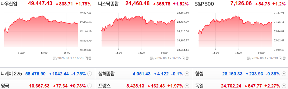 이날 美 증시는 상승했습니다. 이란이 호르무즈 해협을 개방한다고 밝혔고, 종전 기대가 확대되며 투심이 매우 긍정적이었는데요.
