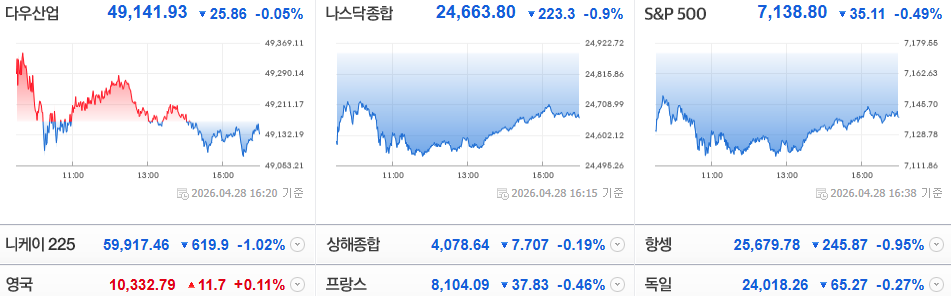 아무래도 전일 美 증시 속 오픈AI 관련 악재가 부각되었고, 내일은 주요 빅테크 실적이 모조리 발표될 예정인 만큼 관망 및 경계 심리가 반영되는 듯 하네요.